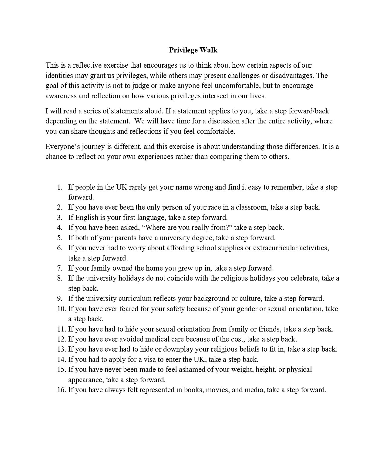 - Second, we invited students to participate in a privilege walk (an interactive activity where participants step forward or backward based on statements reflecting social advantages or disadvantages, highlighting differences in privilege).