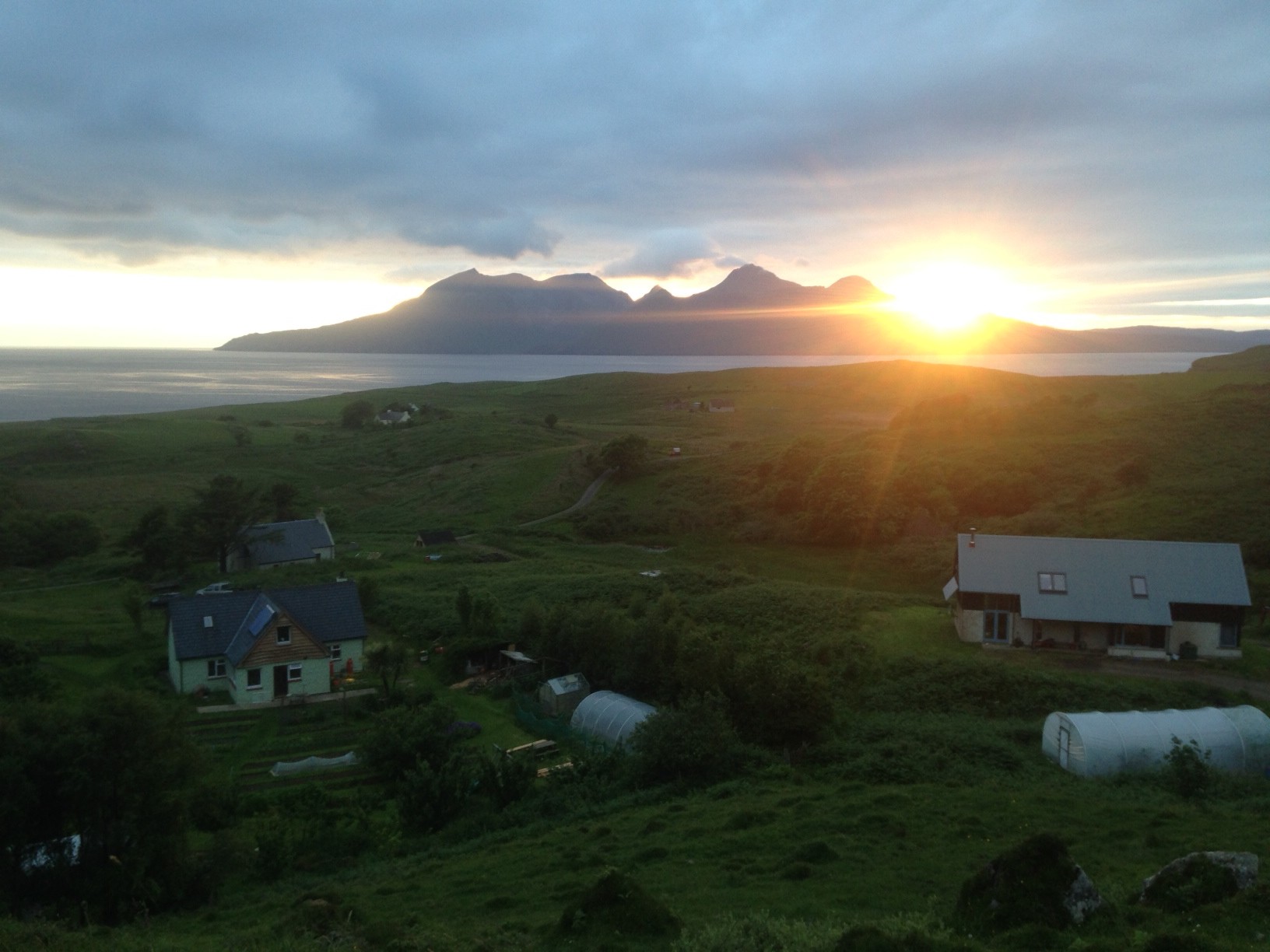 Upon finishing the most arresting 4-miles my feet have ever wandered, we arrived at Eigg Organics. Neil met us, baby sheep at his side, and directed us towards the campsite, pointed out the compost toilet and water site, and stated that any firewood should be collected at the beach. Because trees are numbered on the Isle of Eigg, firewood is hard to come by and generally imported from the mainland. A handful of us journeyed to find driftwood, but found much more drift plastic. We carried the few logs back up the hillside and began the hour’s challenge of starting a fire with the windy island breeze. We made dinner and watched the sun outline the Isle of Rum for what felt like hours. The sun seemed to act as a child at bedtime begging to stay up just a bit longer and postponing sleep with every effort simply because they are not ready to say goodnight to the world.