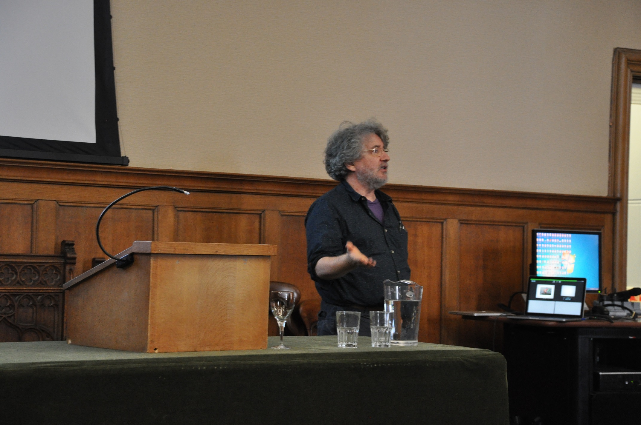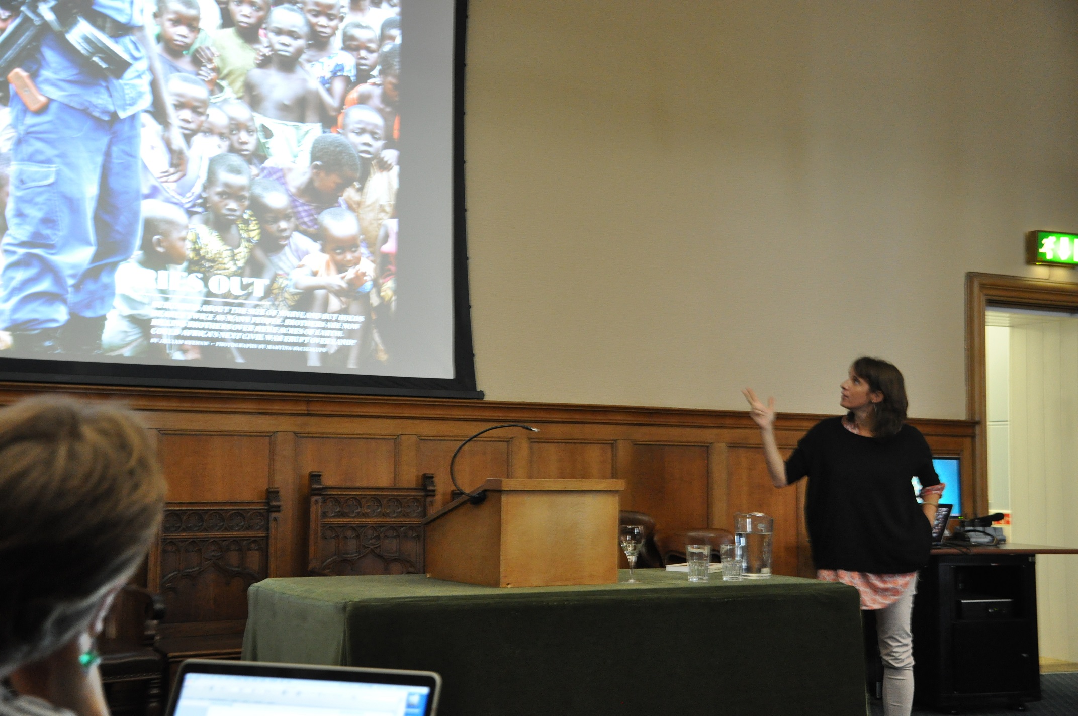 The first speaker, Paul Lowe (London College of Communication, University of the Arts London), discussed the use of photography in social and ethical discourses using examples from his exhibition project ‘Picturing Moral Courage: The Rescuers’. By capturing the portraits and stories of individuals who risked their own lives to save the lives of others in instances of mass violence and genocide, Lowe invites audiences to hear the testimonies of those pictured with empathy and recognition: to bring to light the personal and human sides of global issues and to make accessible the narrative of the ordinary hero. Lowe’s portraits capture powerful, emotionally charged moments of reunion and testimony. His exhibition aims to provide relatable moral role-models for recovering post-conflict communities to spark positive, active participation in peacebuilding efforts. To this end, the photographs have been made available online and as a travelling outdoor exhibition in order to bring Lowe’s work and its messages to new, usually untargeted audiences. The exhibition has become a focal point for youth workshops across the globe, bringing together different ethnic groups to consider issues of violence, human rights and peace. Responding to audience questions, Lowe expanded on the difficulties of capturing portraits in fraught communities where individuals are afraid of being outspoken, yet ultimately stressed that working together on common creative projects allowed participants to enter into new discursive and collaborative territories.