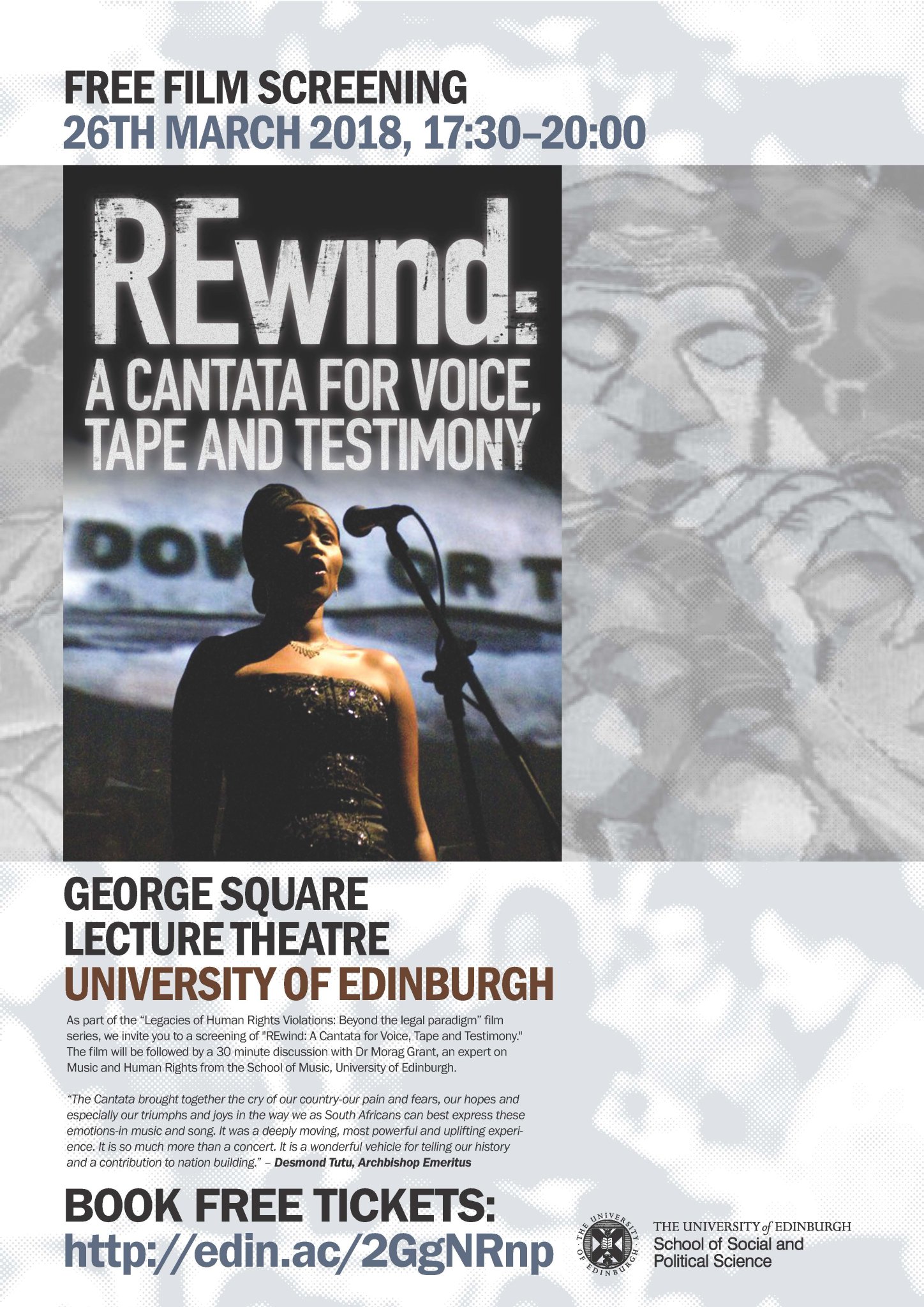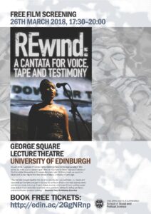 The third movie, “REwind: A Cantata for Voice, Tape and Testimony,” directed by Liza Key (2009) presents a cantata created by Phillip Miller’s about the work of the Truth and Reconciliation (TRC). With an emphasis on sound, Key portrays poetically the musical work of Miller that conveys the human stories behind the TRC testimonies. The documentary contains footage of the cantata itself that combines vocal soloists, chorus, and string octet footages, along the voices of victims, resistance fighters and government oppressors taken from recordings made during the actual hearings of the commission. All these different visual and sound aspects are put together to addresses oppression, violence and human rights violations that took place during Apartheid in South Africa. Rewind is an original piece of art about another piece of art that address human rights from sensorial perspectives. The discussions with the 20 students attending was led by Dr Morag Grant, an expert on Music and Human Rights from the School of Music, University of Edinburgh. She encouraged us to think who is the targeted audience of such piece? She questions the choice of Miller to address the Apartheid and the work of the TRC through Opera. As a rather elitist style of music, is it a relevant channel to give the voice of victims of oppression with different popular engagements with music? In line with many critiques of the TRC in South Africa, the discussions also addressed how victims can be silenced through the various institutional channels that allegedly aim to ‘give them a voice.’