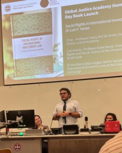 The Global Justice Academy celebrated Human Rights Day 2025 with the launch of Luis Yanes’ new book, Social Rights in International Investment Law: Reconciliation and Integration. An enthusiastic group of current students, former students, and colleagues gathered at the Old College to celebrate and hear from Dr. Yanes and discussants Professor Katie Boyle, Chair of Human Rights and Social Justice at the University of Strathclyde, and Dr Ana Maria Daza Vargas, Senior Lecturer in International Economic Law at the University of Edinburgh. Dr. Yanes is a guest lecturer in international human rights law at the University of Edinburgh, drawing from his expertise of almost twenty years of involvement in human rights across the globe. He currently serves as the Scottish Human Rights Commission‘ s expert on economic, social, and cultural rights.