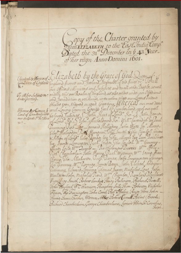 Copy Letters Patent of Elizabeth I granting to the Earl of Cumberland and 215 others the power to form a corporate body to be called the “Governor and Company of Merchants of London, trading into the East Indies” and naming Thomas Smith the first governor.: Available through: Adam Matthew, Marlborough, East India Company, http://www.eastindiacompany.amdigital.co.uk/Documents/Details/BL_IOR_A_1_2 [Accessed March 09, 2017].