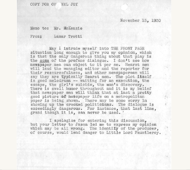 A personal favourite of mine, the Motion Picture Association of America (MPAA) Production Code Administration Files collection documents forty years of self-regulation and censorship in the motion picture industry. The Production Code was written in 1929 by Martin J. Quigley, an influential editor and publisher of motion picture trade periodicals, and Reverend Daniel A. Lord, a Jesuit advisor to Hollywood filmmakers. Officially accepted in 1930 by the Motion Picture Producers and Distributors of America (MPPDA), the precursor organization to the MPAA, the Production Code presented guidelines governing American movie production. It is fortunate that when the Production Code was eclipsed by the ratings system the MPAA made the decision to hold on to the office’s files, and eventually agreed to donate them to a library where they would be made available to researchers.