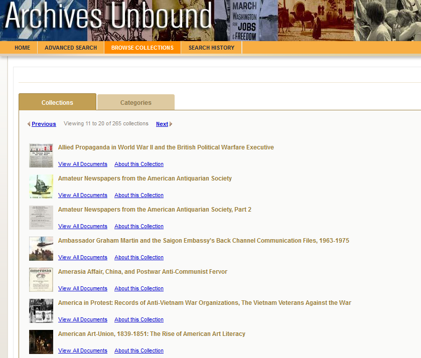 In Archives Unbound you can search through all 265 collections at one time or you can choose to search/browse individual collections or groups of collections.