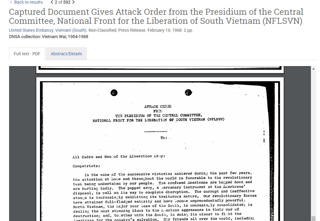 Screenshot showing Captured Document Gives Attack Order from the Presidium of the Central Committee, National Front for the Liberation of South Vietnam (NFLSVN)