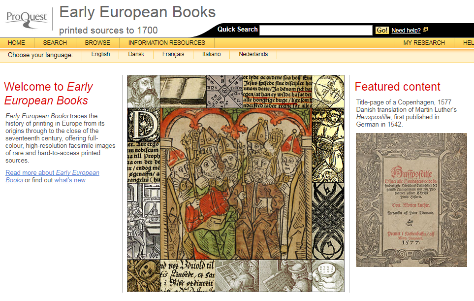 Building on the success of EEBO, Early European Books Online traces the history of printing in Europe from its origins through to the close of the 17th century, again providing high quality digital page images of rare and hard-to-access printed sources. The Library currently has access to Collections 1-4 and UK Collections 5 and 7.