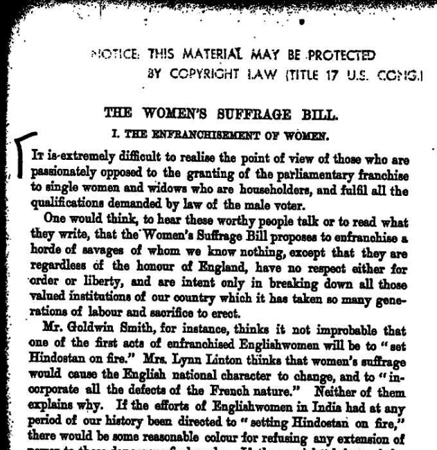 Screenshot from Garrett Fawcett, Millicent. 1889. “The Women’s Suffrage Bill”, Vol. 51, pp555-567. [Empire Online].