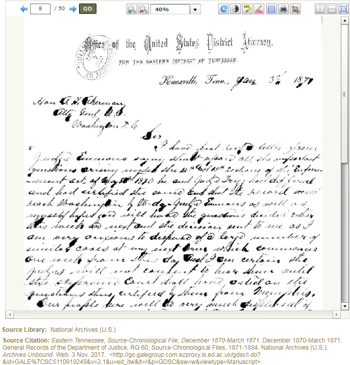 This collection documents the efforts of district attorneys from southern states to uphold federal laws in the states that fought in the Confederacy or were Border States. This publication includes their correspondence with the attorney general as well all other letters received by the attorney general from the states in question during that period, including the correspondence of marshals, judges, convicts, and concerned or aggrieved citizens. This publication comprises the letters and enclosures contained in the source-chronological file for various states in the South.
