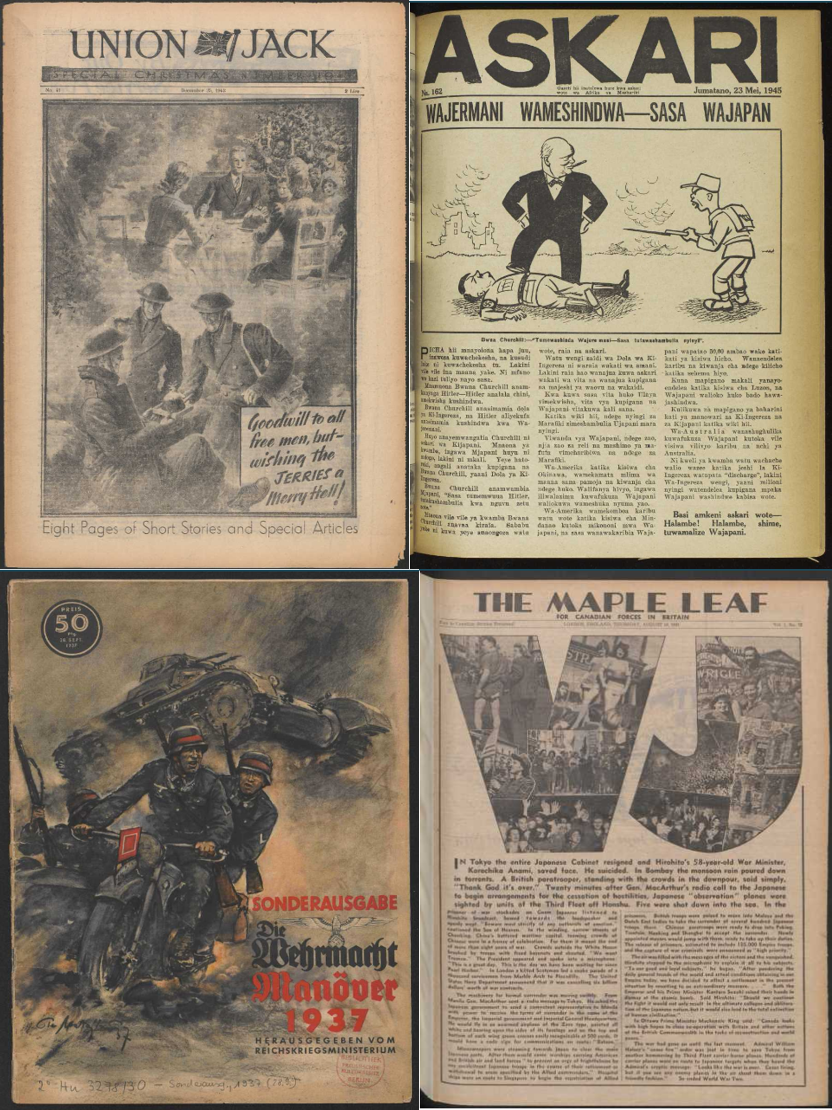 [Clockwise from top left] Front covers of Union Jack (25 Dec 1943), Askari (23 May 1945), The Maple Leaf (16 Aug 1945) and Die Wehrmacht (28 Sep 1937).