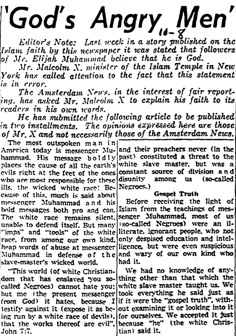 Screenshot of ‘God’s Angry Men’ by Malcolm X from New York Amsterdam News, Saturday, April 27, 1957, p. 18.