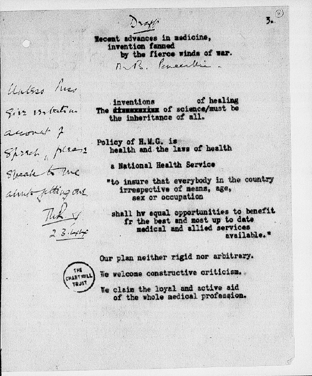 Screenshot of 1st page of partial speech notes for Winston Churchill’s speech on advances in medicine and science to the Royal College of Physicians, London. 2 March, 1944. Part of larger file CHAR 9/204A-C. Churchill Archive.