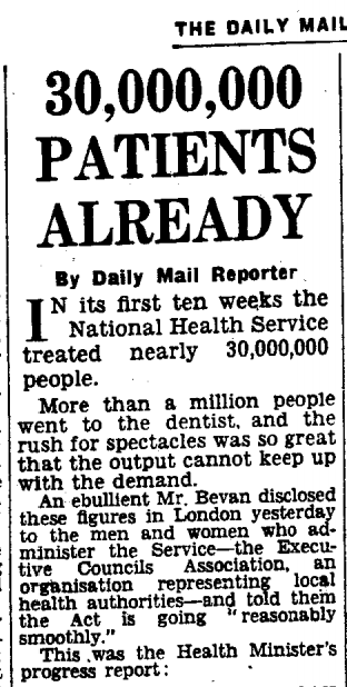 Daily Mail Reporter. “30,000,000 Patients Already.” Daily Mail, 8 Oct, 1948, p. 3. Available from Daily Mail Historical Archive, 1896-2004.