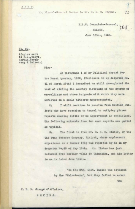 Screenshot from “China: Banditry in China; proposed international police force for China under League of Nations; capture or murder of foreign nationals by bandits; Communist activity; hostilities in [[Mukden]] and danger to British residents” (Government Papers, The National Archives, Kew, 1932). Accessed 1st August 2018.