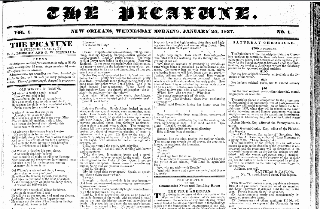 Screenshot of front page from first issue of The Picayune, January 25, 1837.