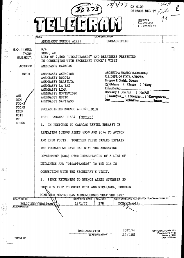 [Screenshot from Argentina, 1975-1980] United, States Embassy. 1977. List of 7,500 “Disappeareds” and Detainees Presented in Connection with Secretary Vance’s Visit. ProQuest.