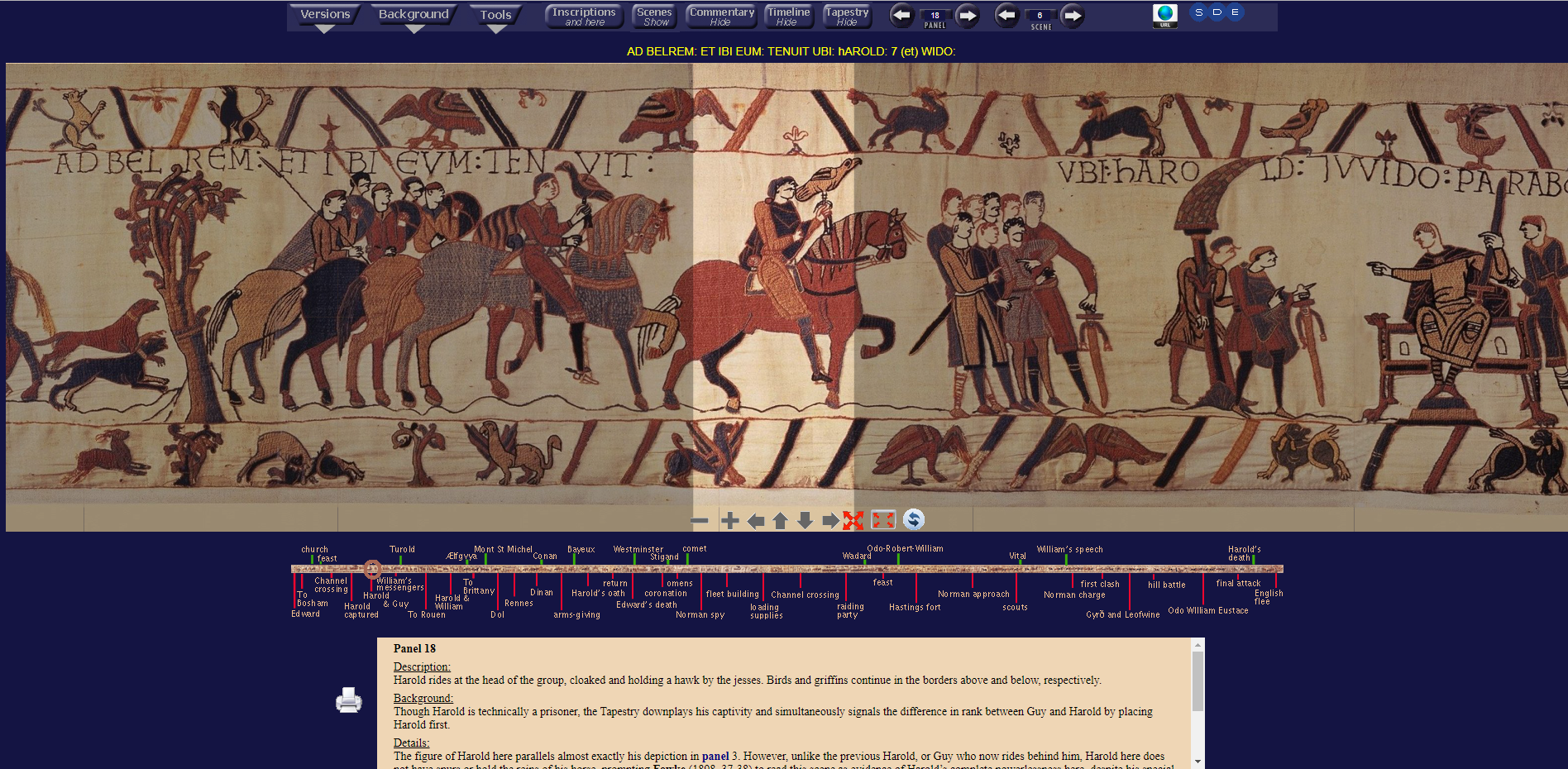 As well as including general descriptions of the forty scenes of the Tapestry, intended as a beginner’s guide, Bayeux Tapestry Online also includes commentary on each of the 173 panels, detailing all major and minor interpretative issues in the Tapestry; the ability to toggle between English and Latin in the inscriptions; a clickable genealogy of William and Harold’s ties to the English throne; an animated and clickable map of English and Norman geography of the Tapestry, and a map of the battlefield; a library featuring translations of seventeen textual analogues to the events depicted in the Tapestry; a museum containing thirty-seven visual analogues (medieval artifacts, manuscript illuminations, archaeological remains, etc.) to aspects of the Tapestry; full scrollable and zoomable versions of three early (pre-restoration) facsimiles of the Tapestry and much, much more.