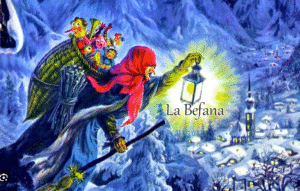 In Italian folklore and folk customs, La Befana is a witch-like old woman who delivers gifts to children throughout Italy on Epiphany Eve (the night of January 5) in a similar way to Santa Claus or the Three Magi. La Befana is a widespread tradition among Italians and thus has many names. She is a part of both popular national culture and traditional folk culture and is akin to other figures who roam about sometime during the Twelve Days and reward the good, punish the bad, and receive offerings. La Befana is a mysterious, contradictory figure of unclear origins.