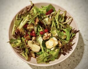Let’s make it: Take your favourite medium sized bowl. Add your favourite salad leaves (My favourite is the baby salad leaves you get in the stores). Toss some pumpkin seeds. If you have pomegranate seeds, what are you waiting for? Toss them in. Break 3-4 walnuts into smaller pieces. Add them in. Dice an apple into small pieces and add it to your salad party. Cube some paneer and then slightly toast it in some oil or ghee (Indian clarified butter). Add this toasted paneer into your salad. If you don’t have paneer, use feta cheese. If you have some sweet salad peppers (bell peppers), you can dice and add them too. Add some black pepper. Add your favourite salad dressing. I like olive oil and balsamic vinegar. Squeeze some lemon on the top. Mix it like you mean it! Ta-da! A very tasty, crunchy, filling salad dinner is ready! You’ve covered seeds, nuts, fruits, greens, protein, citrus – everything! The paneer helps you fill up. Don’t overdo it though – add only how much your tummy can handle. I like to add 7-10 small cubes.