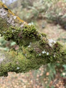 Ellie is sitting outside Billington’s with her partner and one-year-old daughter when I meet her for our walk. They are visiting from their home in the Scottish borders and haven’t been to Lenzie before. I have spoken with Ellie online and exchanged a few emails over the years, but this is the first time that we have met in person. Ellie is an artist, currently working in Scotland’s temperate rainforests – the ancient woodlands of the west coast. She makes sound recordings, films, photographs and sculptures, which respond to the textures and changes in different landscapes. Ellie is interested in questions about time and has been particularly drawn to the microworlds of lichen and bryophytes. She is enthusiastic about my project and the opportunity of a walk round Lenzie Moss. The plan is for the two of us to walk one way and for her family to walk the other, so at some point we will meet.