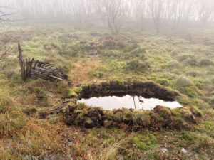 We turn from the boardwalk and head out across the bog. Sandy asks me about the Moss, and I offer a guided tour. Once again I find myself telling the history of peat extraction and the present-day tensions around access and site management. As I deliver my increasingly honed tour script, we pass by the spot that I had previously visited with Jill, and where James and I had recently encountered some workers digging ponds. The work has now been completed and it is clear that these new pools have been deliberately placed in an area that was being used as a regular pathway. This is to protect the fragile peat layer and to create diverse habitats, but I suspect it won’t be well received by all the people who walk here.