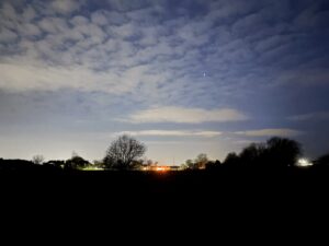 We step away from domestic infrastructure, and onto the darkness of Bea’s Path. It is strikingly quiet and we talk with hushed voices. But it is also busier than expected and we encounter a parade of walkers, some presumably commuting to the station and others with dogs. We see the blinding torchlight first, moving unpredictably through the blackness and difficult to gauge for speed or distance. Then a mumbled or nodded greeting as they pass. When I took an early morning walk with Cathy, it was midsummer and the sun had risen long before we set off. Greetings were much warmer then, but now it seems that nobody is ready or able to connect.