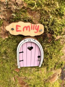 It has rained heavily overnight but this morning the sun is shining brightly through the clouds and the whole place sparkles. It feels like a good day for my second chance to walk with Ruby. She should have been the 19th walker to circle the Moss with me, but as I confessed to Ellie, who took that place instead, I missed my appointment earlier that morning. This cost Ruby a wasted trip all the way from her home near the Pentlands, just south of Edinburgh. Graciously, Ruby has returned today, and I couldn’t be more thankful. I meet her by her car at the far end of the station carpark. As we set off, I notice that a fairy door has appeared in a birch tree.
