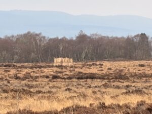 The white seedheads of the bog cotton, which I noticed in May with Ruairidh, won’t be back for a few months now. There has been a new addition to the bog today, though. A couple of conspicuous sections of fencing have appeared in the centre of the Moss, standing out against the subtle colours of the mire. I wonder whether these are to protect bog rosemary, which is rare and precious here, and could quite easily be snapped up by the resident roes. All three of us feel ambivalent about this intervention and I am sure that there will be others who are strongly opposed. I suspect that they won’t be intact for long.