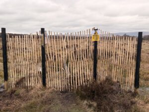 As we emerge from the trees to look out across the bog, Carol asks me about the fencing that has appeared here since her last visit. I explain that it is there to block access, and Carol understands the reasons for this. There has been another development, though. Now several of the fence posts have been painted in a thick black anti-vandal paint, which is visible across the bog. A new sign – already blurred by heavy rain – warns potential transgressors away. The sign that I noticed with Logan is now lying in the mud. So, this is the third sign in just a few weeks, and these have evolved from ‘help make space for nature’ to ‘Please don’t walk on the bog’ to ‘Warning anti-vandal paint’. I worry about how these new physical barriers and the dialling up of rhetoric in the signage will be received.