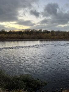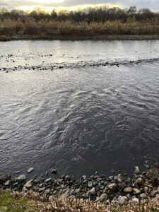 Sometimes I literally immerse myself. Standing in the sandy shallows watching skittish shoals of small salmonid fry and stonefly larvae. Head under, peering through the peaty water with googles on, barely keeping station against the strong current, to see undulating bright green fronds stroking smooth boulders. I’ve seen otters loop-leaping, cormorant-like, to stay in one spot like this and wondered what it is they were so determined to keep track of on the riverbed.