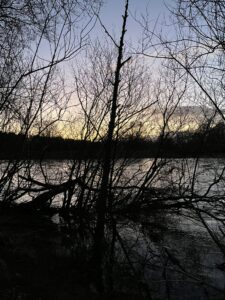 The river is both constant and ever mobile. The strong flow carves out the banks, undercutting the turf to expose packed boulders and tree roots. The trees slow tumble towards the inevitable. Even this I can mark with my daily walks – today I need to duck under this tilted limb where yesterday I could climb over it.