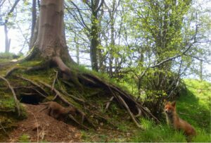 Figure: Amidst the roots of a beech tree whose roots drop down towards the burn, a vixen and her mate have raised a litter of cubs. The vixen above encourages one of her cubs to venture out and explore whilst the dog fox provides reassuring presence as the cub returns to the shelter of the earth.