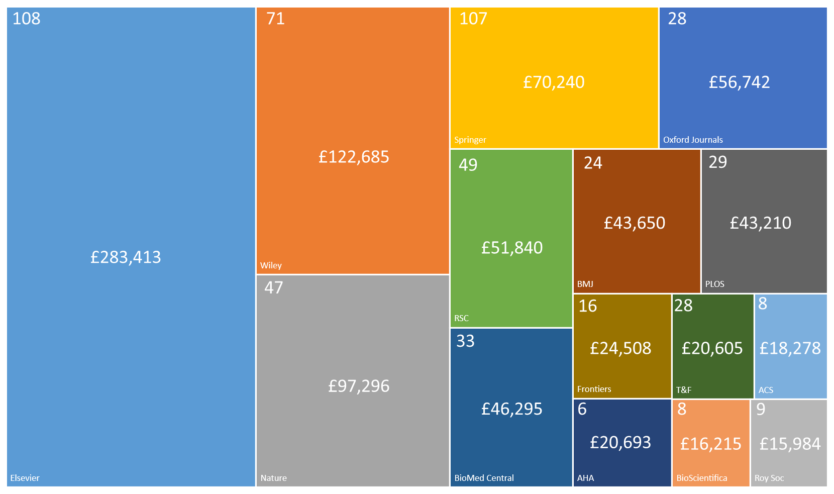 A summary of the open access charges made to the top 15 publishers is shown in the table and figures below:
