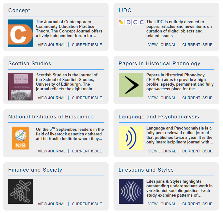 Edinburgh University Library supports the publication of academic and student-led open access journals by providing a journal hosting service using the Open Journal Systems software. The Open Journal service is available to University of Edinburgh students and academics and is provided free of charge.