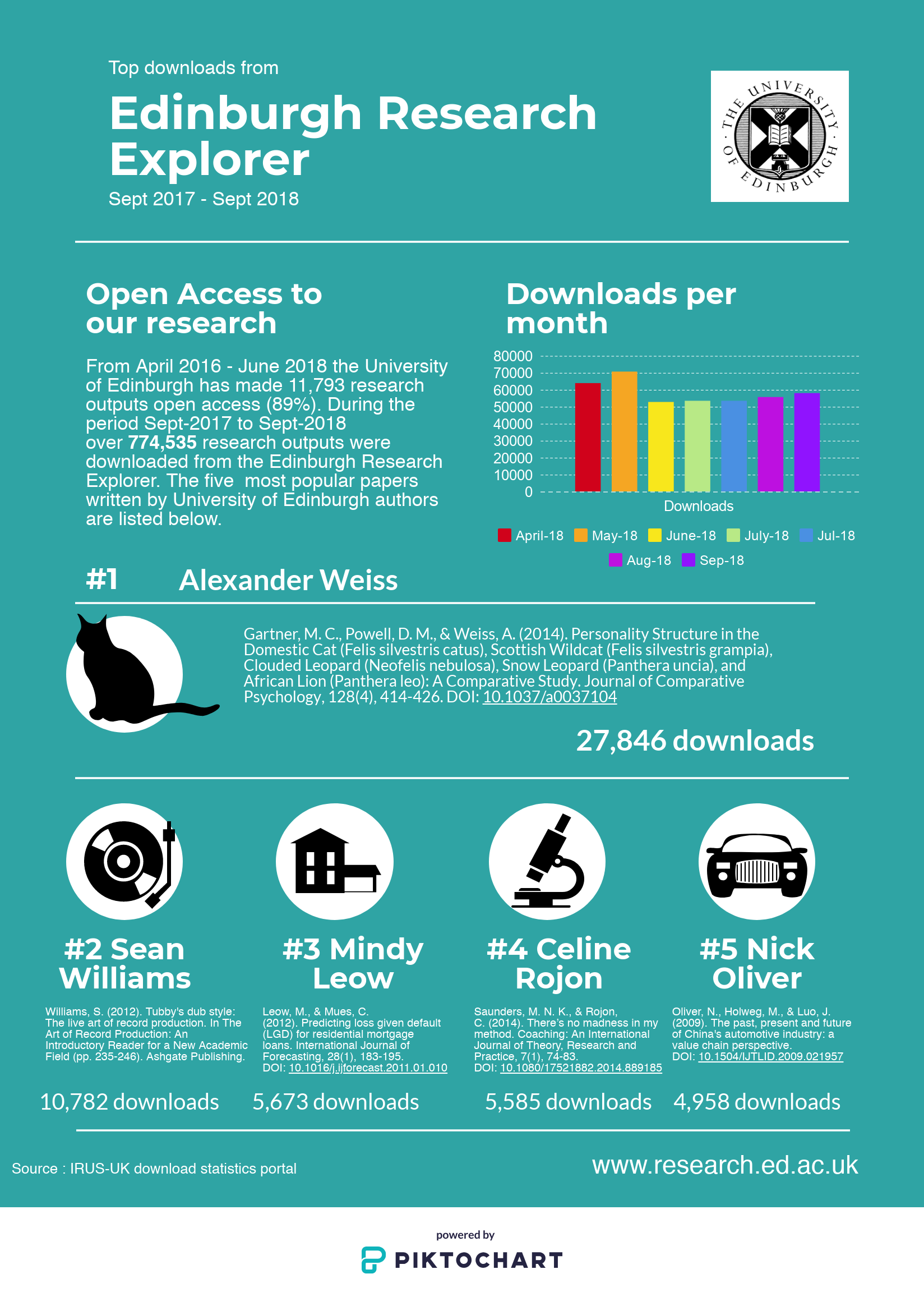 During the period Sept-2017 to Sept-2018 over 774,535 research outputs were downloaded from the Edinburgh Research Explorer. This equates to nearly 65,000 downloads per month.