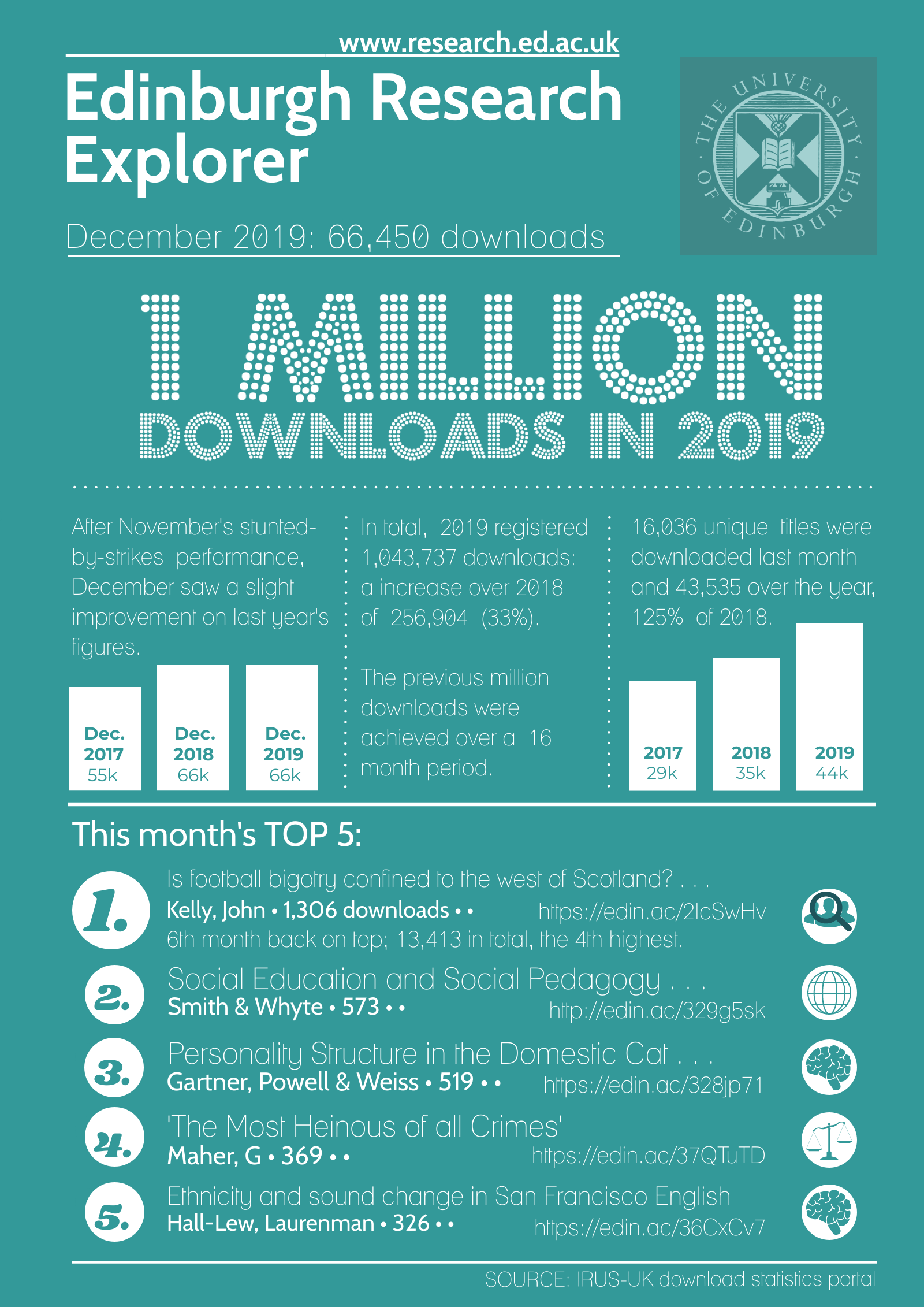 Edinburgh Research Explorer Statistics: December 2019 Published 14 January 2020 by mlogan Jan 14, 2020 Edinburgh Research Explorer Statistics: December 2019 / Open Scholarship by is licensed under a Published in Collections, Gold OA, Green OA and Open Access December 2019downloadsEdinburgh Research Explorergold open accessgreen open accessopen accessrepositoryscholarly communications Previous Post New: DOI minting for PhD theses Next Post Edinburgh Research Archive Statistics: December 2019