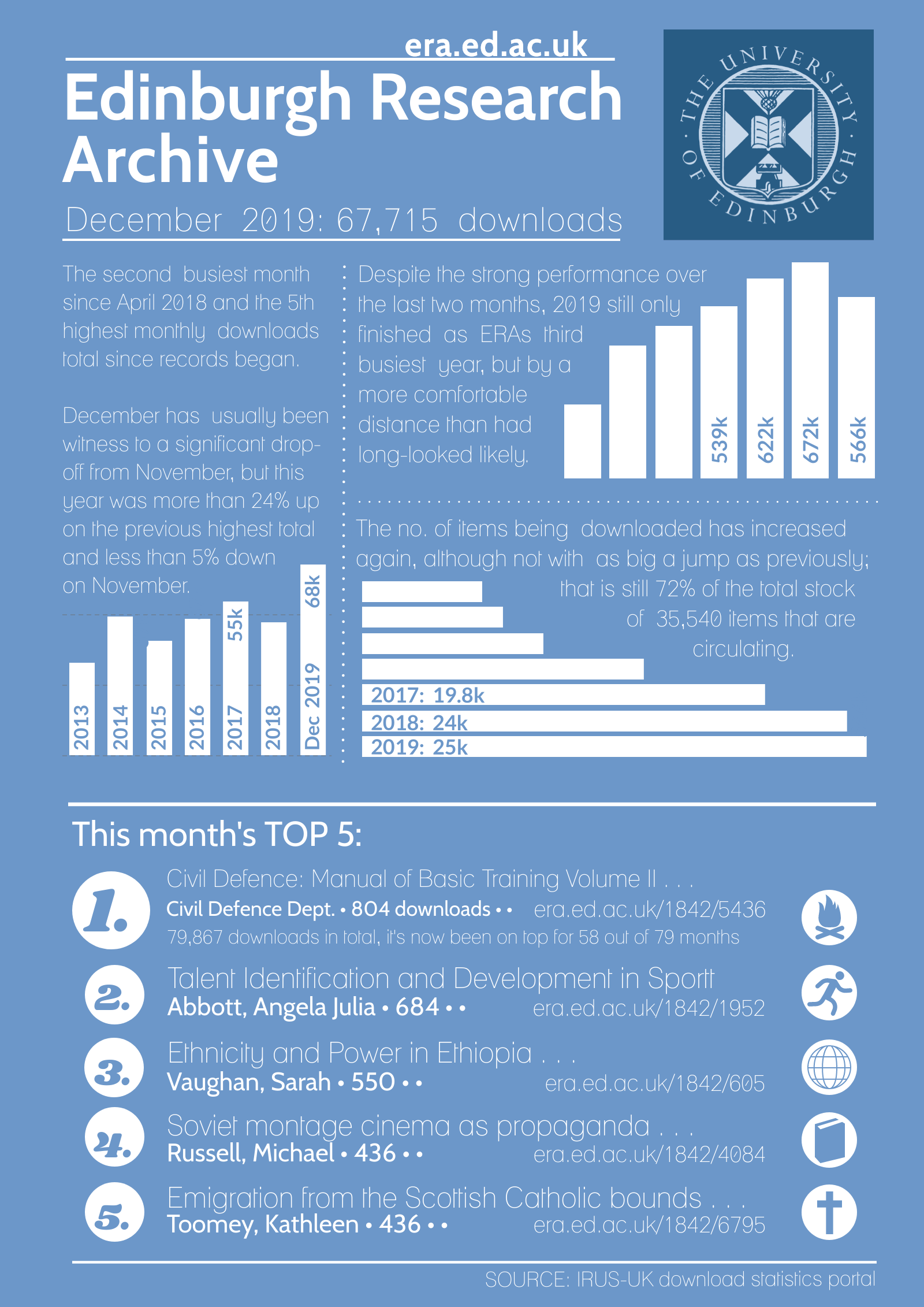 Edinburgh Research Archive Statistics: December 2019 Published 21 January 2020 by mlogan Jan 21, 2020 Edinburgh Research Archive Statistics: December 2019 / Open Scholarship by is licensed under a Published in Collections, DSpace, Library and Open Access downloadsdspaceedinburgh research archiveERAphdrepositoryscholarly communications Previous Post Edinburgh Research Explorer Statistics: December 2019 Next Post Edinburgh Research Explorer Statistics: January 2020