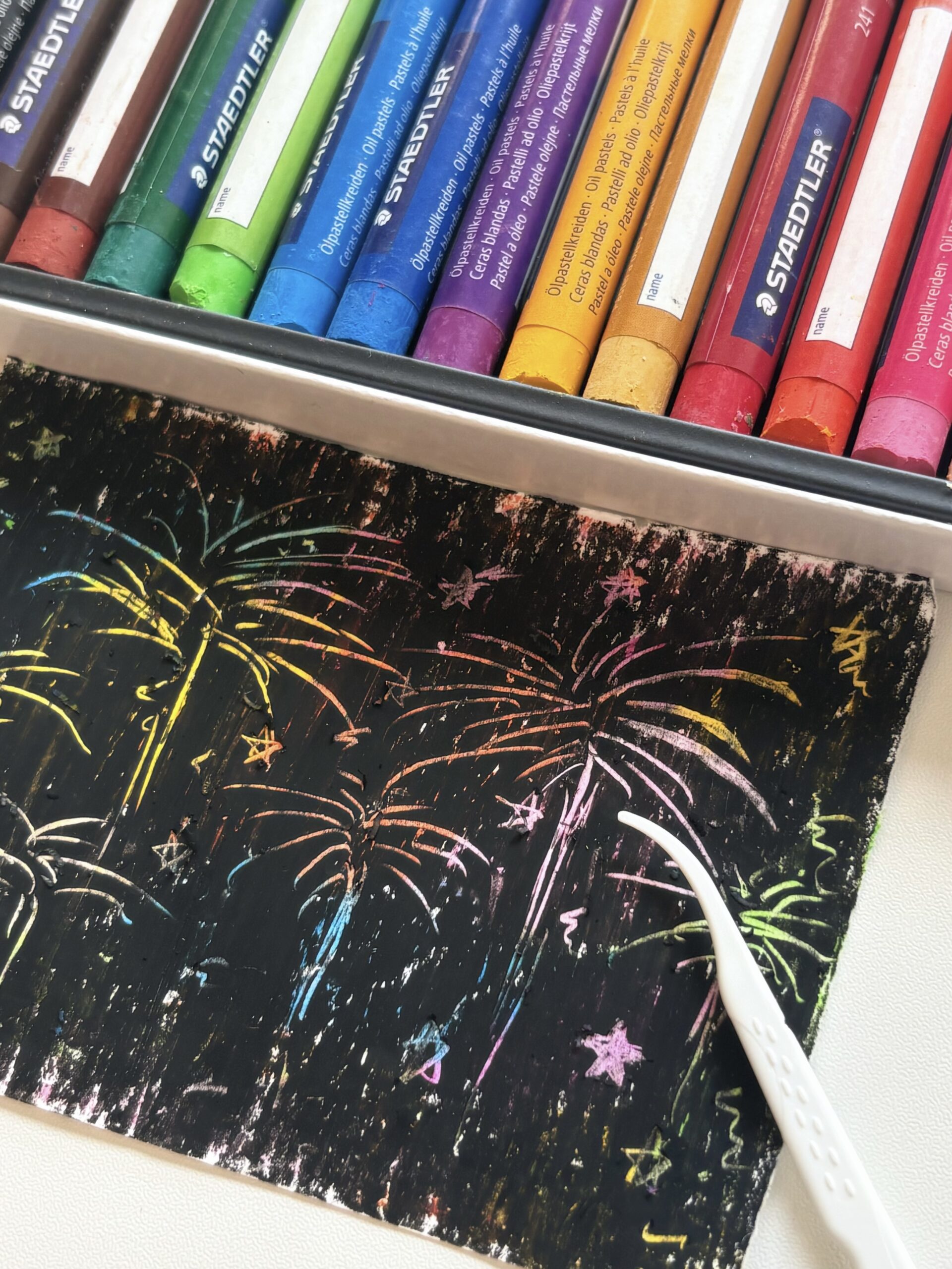 Choose a few colors from colored oil pastels that you think can represent this emotion (no less than 2 colors), and try to transform the thing that makes you anxious into an image in your mind.