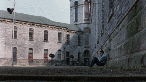 Shot Analysis: This is a close-up shot, with the two figures positioned back-to-back in a symmetrical composition. The woman appears on a surveillance monitor alongside the man within the same frame, indicating her position as the subject of scrutiny and establishing their current roles as interrogator and suspect. The subsequent close-up slowly pulls back, shifting focus between the pair. Their symmetrical composition now suggests their relationship is blurring, transitioning from police officer and suspect to that of a man and woman interacting.