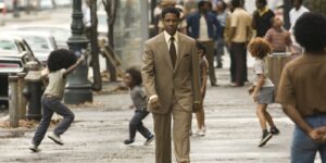 Shot Analysis: A wide-angle long-depth-of-field shot employs a panoramic perspective. The elongated corridor and the security guard’s imposing figure accentuate the woman’s diminutive stature. The composition employs symmetry: though the woman, security guard, and car occupy symmetrical positions, the vehicle visually dominates the frame far more than the kneeling woman. Positioned low in the shot, she is dwarfed by both the car and the guard. As the vehicle speeds away, her isolation, helplessness, and despair are intensified. The visual centre is flooded with light, while the woman remains shrouded in darkness, foreshadowing her bleak circumstances and foreboding future.