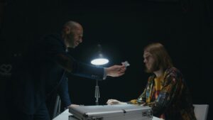 A close shot shows a man speaking to a woman in an interrogation room. The woman, viewed through surveillance footage, appears alongside the man in real life within the same frame. They stand back-to-back in a symmetrical composition, with the camera’s focus shifting between them.