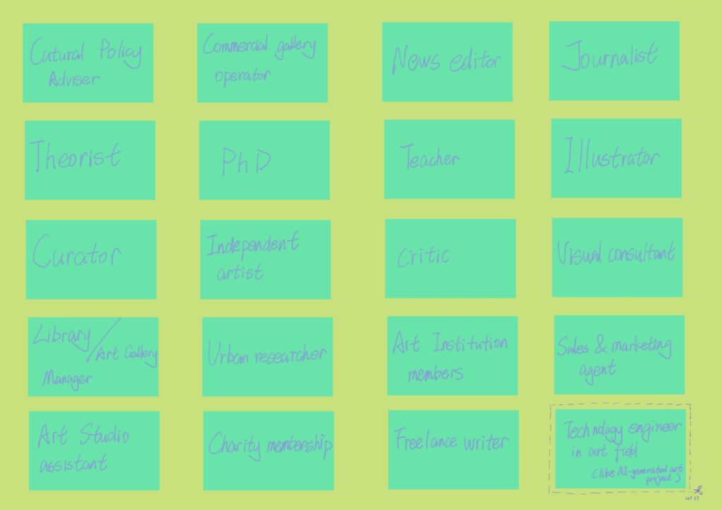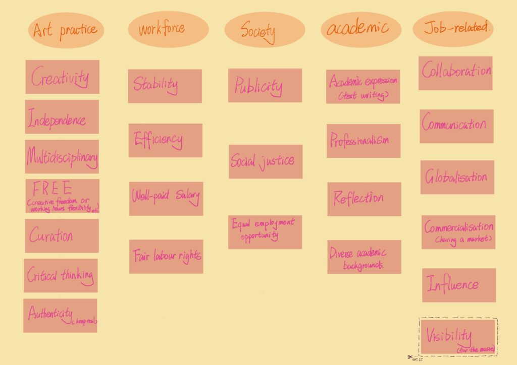 Example 2: UNESCO (1980, cited in Lingo & Tepper, 2013) adopted a proposal on the status of artists, encouraging member states to recognise ‘the vital role of the arts in the life and development of individuals and societies’ and to ‘protect, defend and support artists and their creative freedom.’ Consequently, the keyword cards for influence, multidisciplinarity and globalisation could relate to UNESCO-like jobs such as cultural policy advisor, freelance writer and journalist.