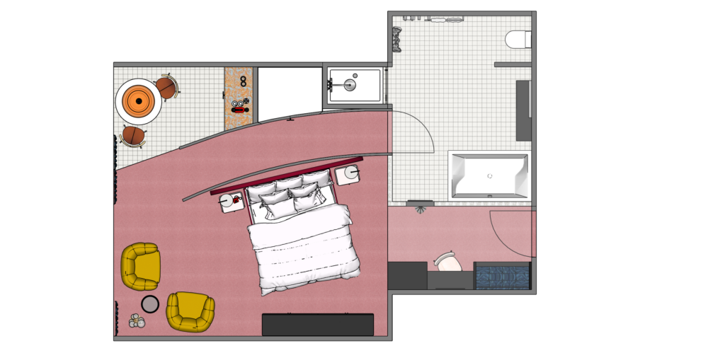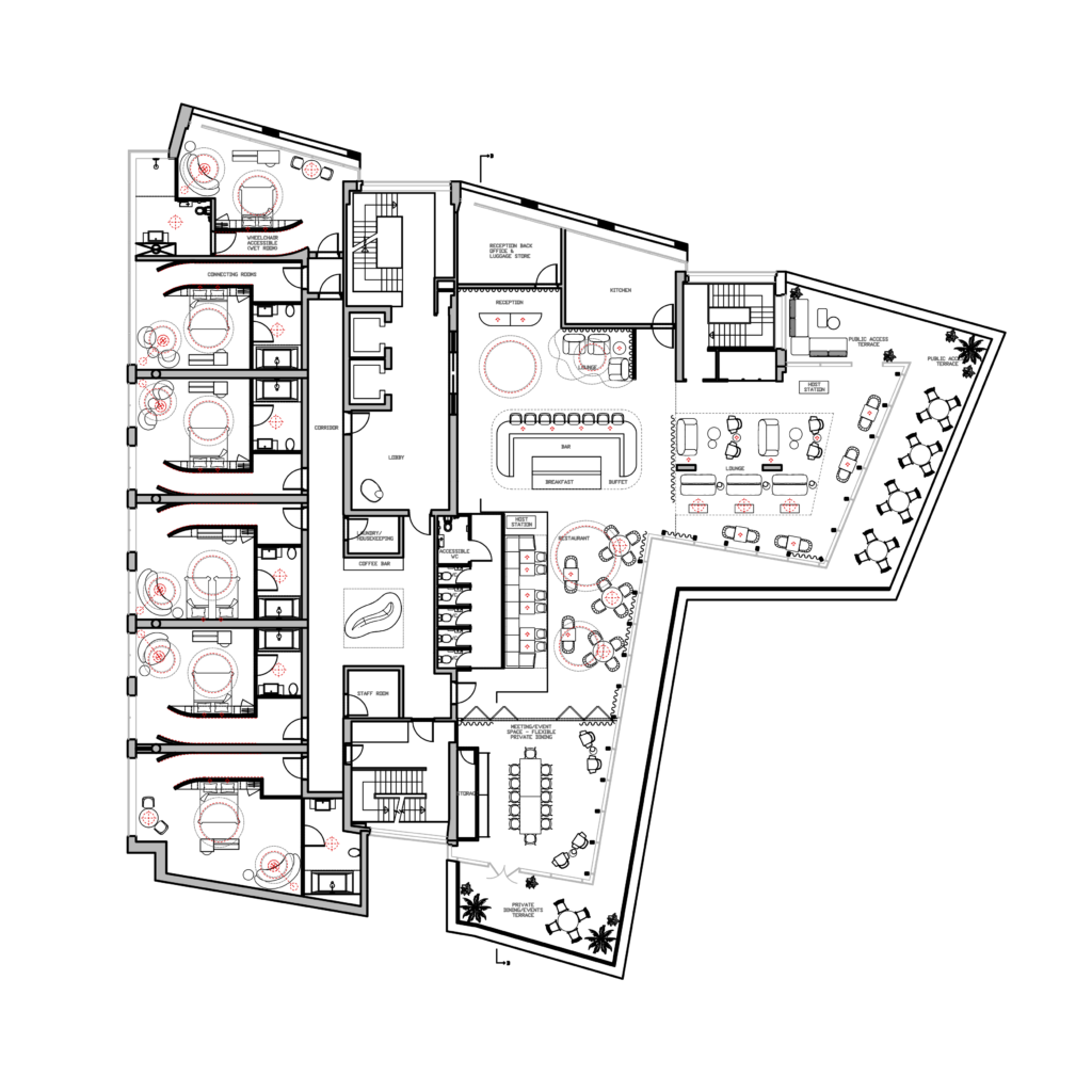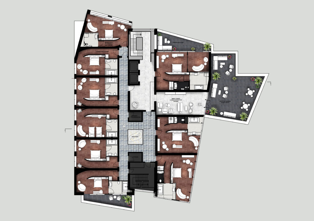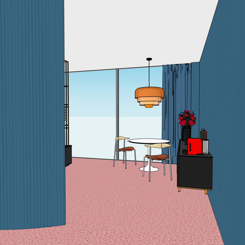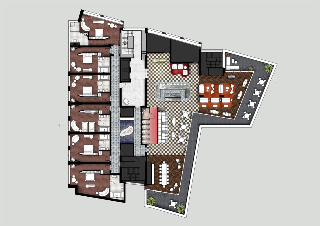 Having reached a concluding point in the design process for this project, I set about creating a SketchUp model of the public spaces on the fourth floor to offer a more complete sense of what it might be like to journey through these areas. Although these spaces are open plan, the ways that they are divided up created some challenges in terms of creating a full sectional view through these areas – so I felt this might be a useful aid in understanding the guest experience.