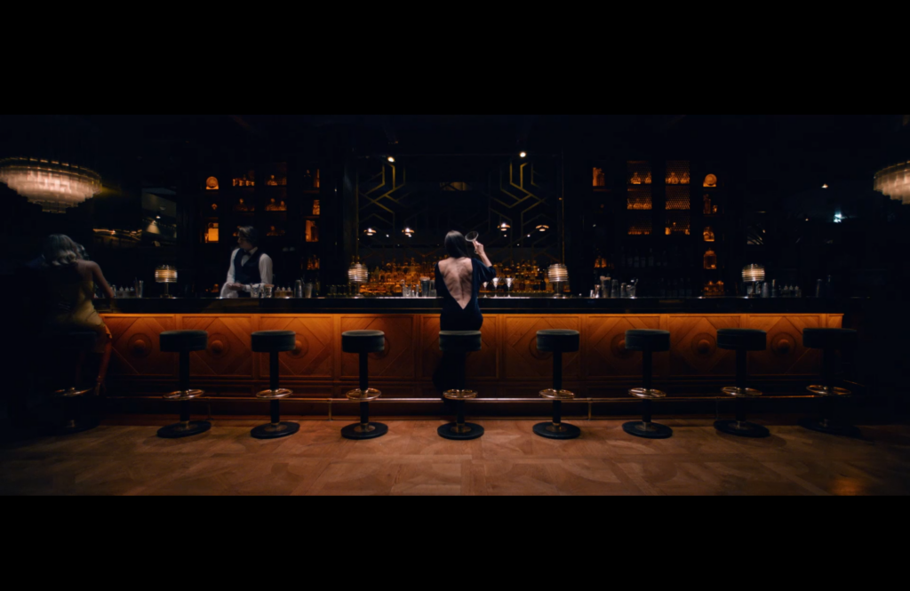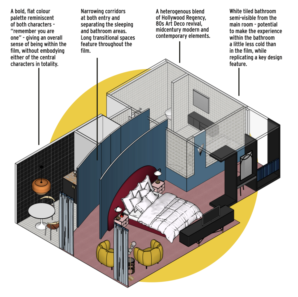 The yellow light fixtures, mimicking the repeated imagery through the film of duality