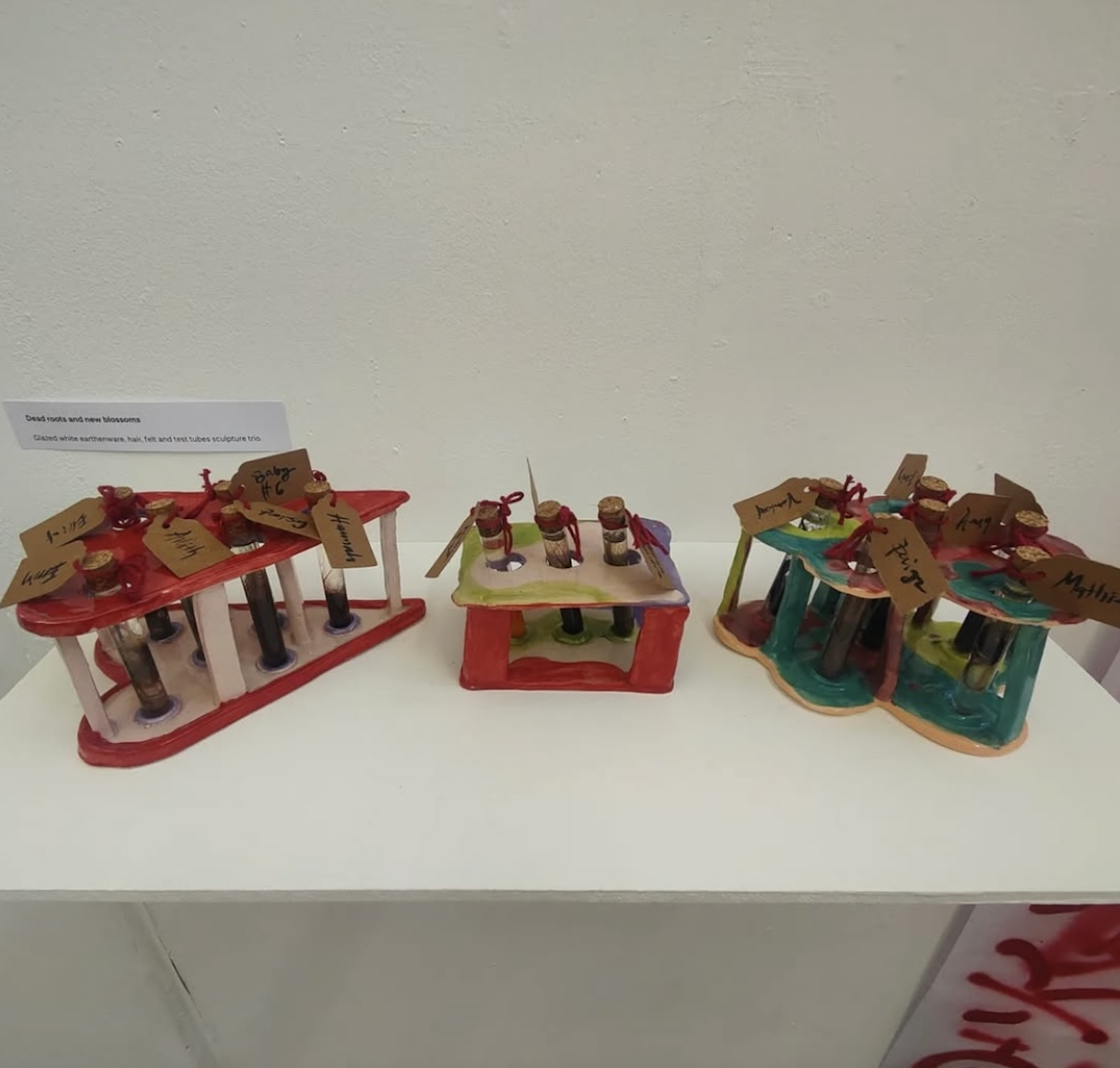 This is a piece of installation art. It is three ceramic shelves, and the artist has left the hair she cut from her friends or some classmates inside this shelf, wanting to turn some dead memories or some unpleasant things into something happier. Let it become a seed, then sprout, and it can become a happier thing. Because in society, hair on a woman’s body is considered an offensive thing, or something that lacks charm, the artist wanted to use the hair and fur on the human body to make something beautiful, just like some of the artist’s current works.