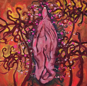 2. San Zhang (Zhang Zixin): Born and raised in Madrid, she later went to study in the UK and lived in Scotland for about five years. She graduated from the University of Dundee with a first-class honors degree in Fine Arts and has worked as an exhibition assistant at the V&A Museum and DCA Gallery. She is a multidisciplinary artist who mainly engages in sculpture, painting and performance art creation. Her exhibited work “Birth love death, vagina pussy cunt” series (three pieces in total) uses materials such as oil painting, acrylic, beads and sequins to explore the relationship between the female life cycle and death.