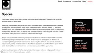 I also discovered that I could participate in the Outspaces program. This organization provides flexible commercial vacant spaces for exhibition projects for free in Scotland. Moreover, the flexibility of these spaces has certain connections with the history of the movement of groups.