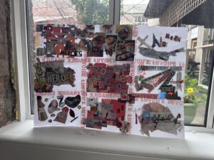 Kirsity shared an image work related to cameras, which collected a large number of close-up shots of people holding cameras and taking pictures. We discussed together where this work would be suitable to appear in an exhibition and how it should be presented. Then, we shared our respective planning progress and offered some suggestions for each other’s projects. Finally, we completed the assembly of the collage poster together, took a group photo, and decided to conduct a mock exhibition with the theme of “No Heroes” next week. I will be responsible for the visual design work.