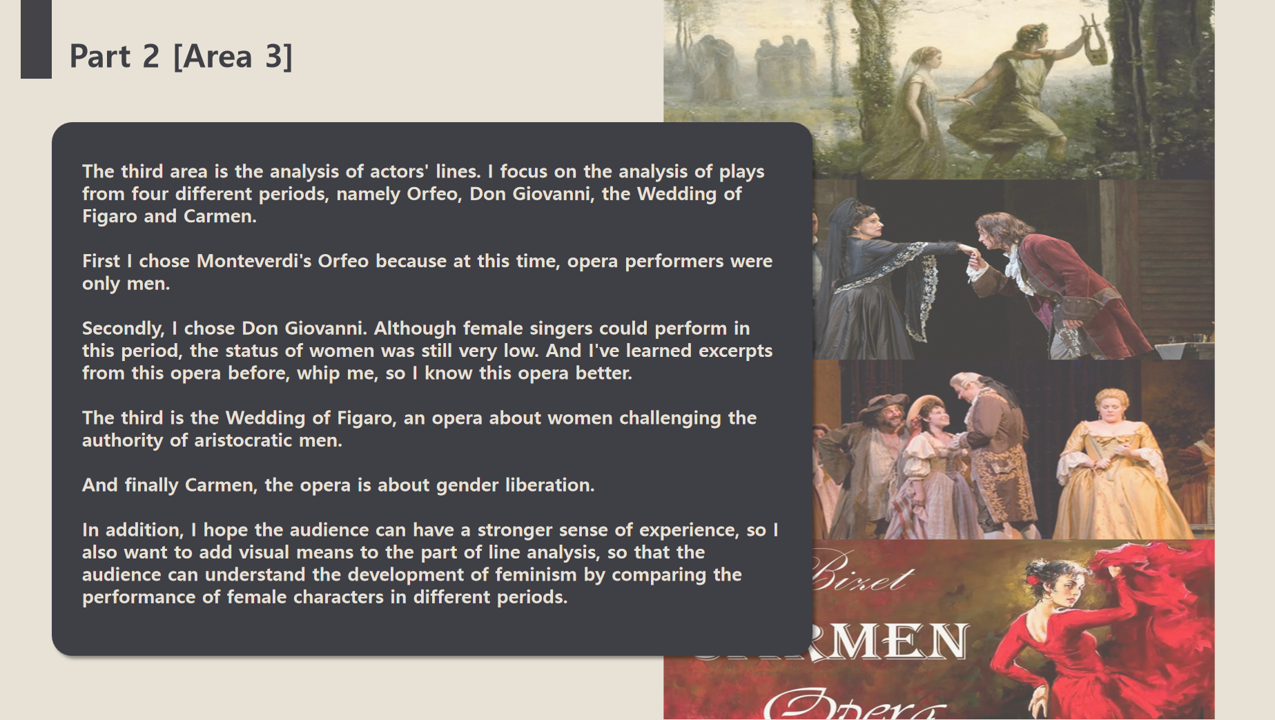 I gave a presentation on my project this week, and I’m glad you had some helpful suggestions for my project. In addition, Adam’s tutorial also gave me a lot of new inspiration and provided me with a lot of related exhibitions. According to the suggestions made by everyone in the class, I will systematically revise my exhibition. First of all, the development history of opera and the feminist movement are combined to sort out a time line, so that the connection between the two becomes clearer. Secondly, four operas from four different periods were selected for analysis. I finally selected Orfeo, Don Giovanni, The Wedding of Figaro and Carmen, which can intuitively show the change of women’s social status and thoughts. In addition, I also made adjustments to the overall structure of the exhibition. I further expanded the scope of interactive display in the fourth part by adding the dressing area and dubbing area for the audience to experience, further enriching the interest of the exhibition and using this part to increase the income of the exhibition. Finally, I also added derivative products for the exhibition, such as postcards, canvas bags, badges, ornaments, etc., to provide possibilities for future cooperation with artists or design companies.