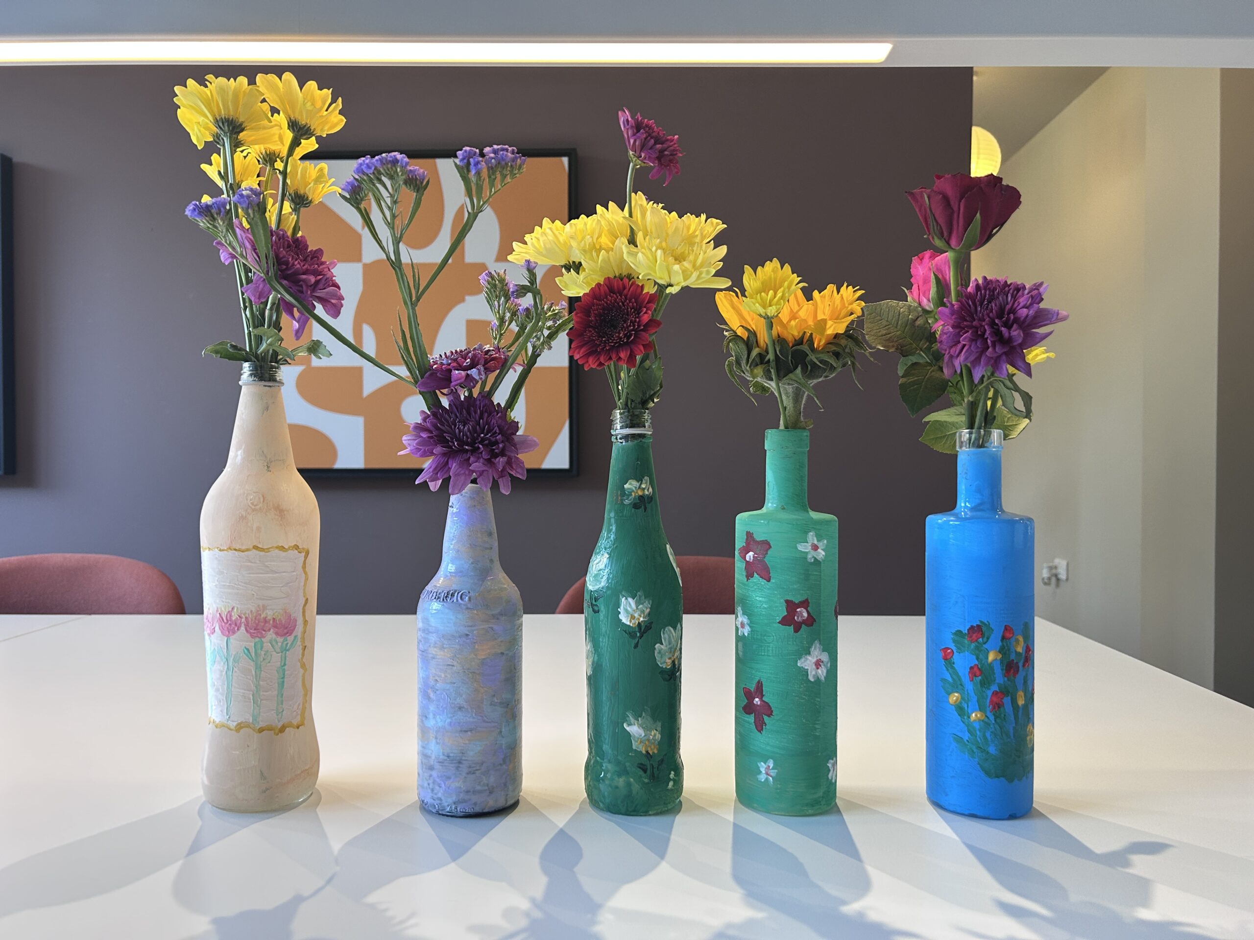 came up with the idea of reusing discarded wine bottles, coloring them with acrylic