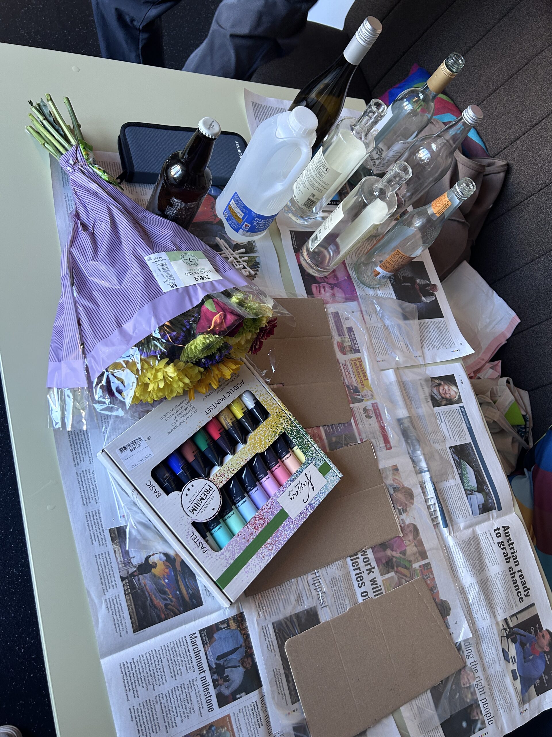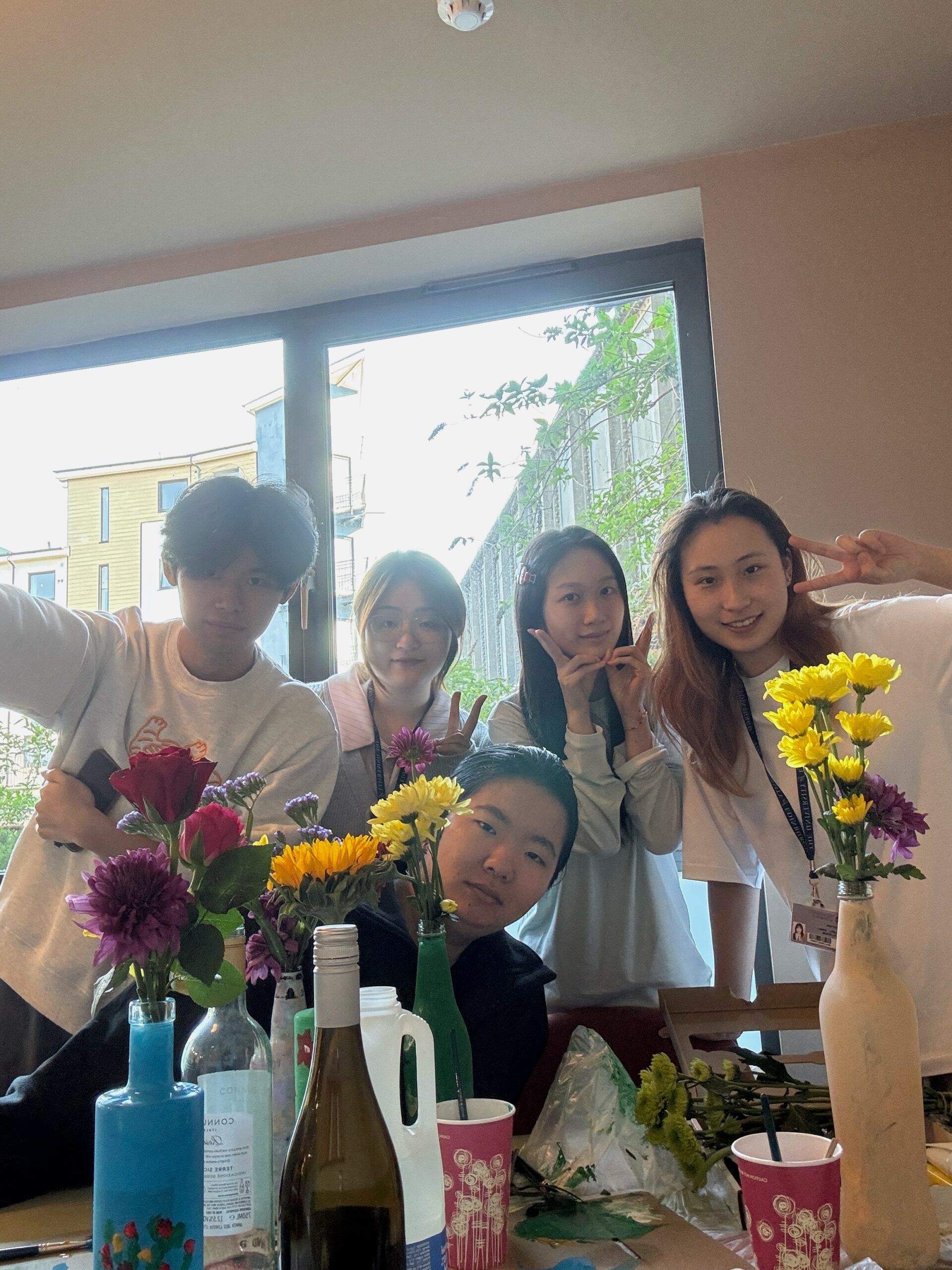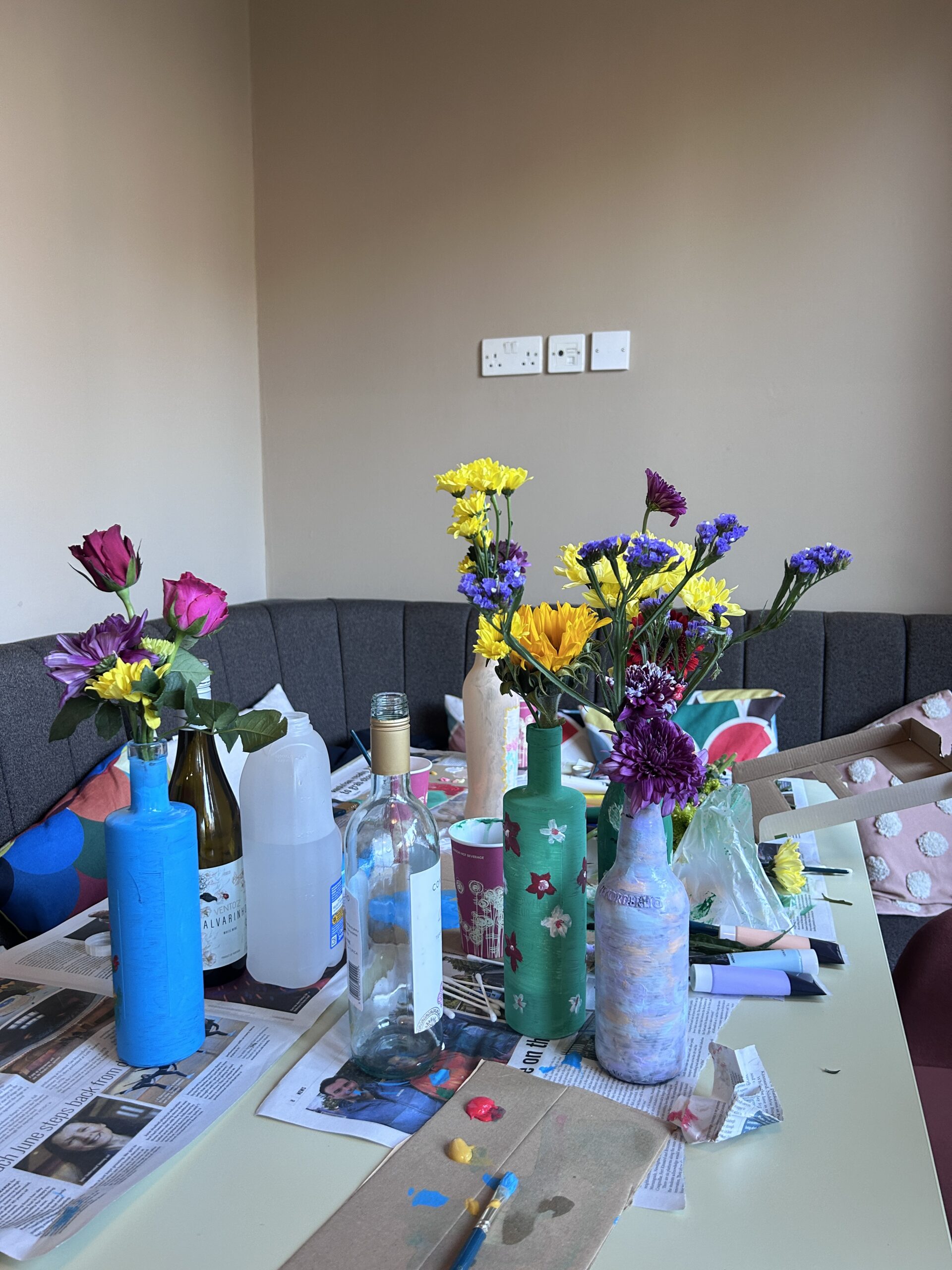 This week, together with my classmates, we carried out the re-modification of used wine bottles. We collected many empty wine bottles and prepared acrylic paints, brushes and flowers.